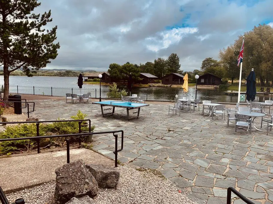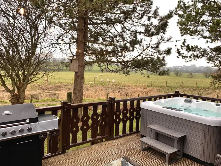 Our south facing private rear balcony boasting its own private hot tub exclusively for your use (The only one at Pine Lake!) There’s garden furniture and a 7 burner Charles Bentley gas BBQ
